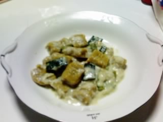 <材料>(2人分) カボチャ 200g 薄力粉 50~60g程度+打ち粉用 ホワイトソース 適量 塩 適量 パルメザンチーズ (お好みで) 1、カボチャの種とわたを取り除き、煮物を作るくらいの大きさに切る。 2、1を電子レンジで柔らかくなるまで加熱する。(5分程度) 3、熱いうちにカポチャの皮を取り除き、ボールに裏ごしする。(裏ごしできない場合はマッシャーでつぶす。フォークやスプーンでつぶしてもよい) 4、3に薄力粉をふるいながら加え、生地がまとまるまでこねる。(耳たぶのかたさくらい) 5、平らな所に打ち粉をし、そこで4を棒状にする。 6、5を一口サイズに切り分け、フォークの先ですじをつける。 7、たっぷりの熱湯に塩をいれ、6をゆでる。6が浮いてきたらざるにあげる。 8、フライパンでホワイトソースを弱火で加熱しながら、チーズ、塩、コショウを加えて味を調える。 9、ホワイトソースに7をからめて出来上がり。 モチモチした食感がおいしいニョッキです。 ニョッキの定番はジャガイモですが、今回はカボチャで。 ・・・かぼちゃの方が水分があるので、難しいのですが。 まぁ、難しいといっても初心者でも作れるくらい、簡単ですのでご安心を! カボチャの水分の量により、薄力粉の量は調節してください。 あと、ニョッキの生地を作る時に、薄力粉と一緒にパルメザンチーズを入れてもおいしいです。 チーズが苦手な方は、ホワイトソースに入れなくてもおいしくいただけます。 ソースはホワイトソースでも、バジルでも、トマトソースでもなんでもいいです。 カボチャのニョッキにはホワイトソースが、じゃがいものニョッキにはトマトソースが特に合うと いう方が多いのですが、結局は自分の好みですから(笑) 本場のふわふわしたニョッキがつくってみたい・・・ |